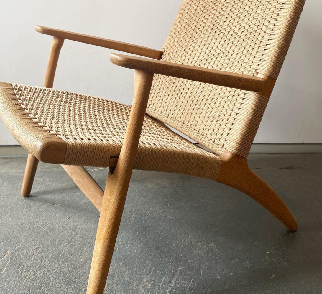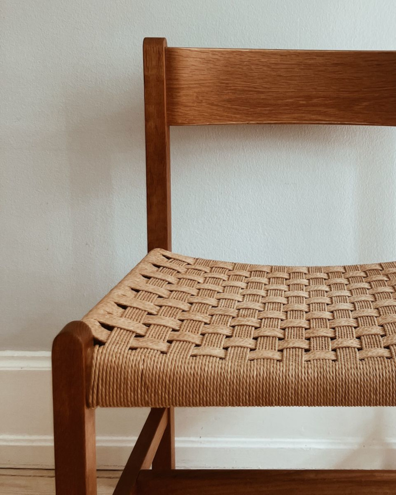 A danish cord kötés a skandináv bútoripar egyik jellegzetes kézműves technikája, amely a XX. század közepétől vált népszerűvé. A fonat főleg ülőfelületekhez és háttámlákhoz használatos, de a kortárs designban modern bútorok dekoratív elemeként is megjelenik pl.: szekrényajtón, térelválasztón. A Danish cord papírból készül, amelyet háromrétegű, erősített zsinórrá sodornak. Két változata van: laced– vastagabb és unlaced – vékonyabb-. A papírzsinóros kötés készítés során a zsinórt részben a kerethez rögzítik szögekkel vagy kis kampókkal, majd sorban, precíz kereszt mintázattal fonják át az ülőfelületet. Ez a technika lehetővé teszi, hogy a fonat egyszerre legyen feszes, rugalmas és tartós. Minden szálat gondosan feszítenek és igazítanak, így az ülőfelület egységes és stabil lesz. A danish cord fonat nemcsak erős, hanem esztétikus is. A természetes színű vagy fekete papírzsinór elegánsan harmonizál a fa kerettel, így a bútorok egyszerre modern, minimalista és időtlen hatásúak. Minden darab kézzel készül, ami azt jelenti, hogy a fonat apró részleteiben mindig egyedi karaktert hordoz. Ez a technika nemcsak a skandináv dizájn hagyományait őrzi, hanem a mai napig népszerű választás azok számára, akik a kézművességet, az egyszerűséget és a tartósságot keresik egy-egy bútordarabban.